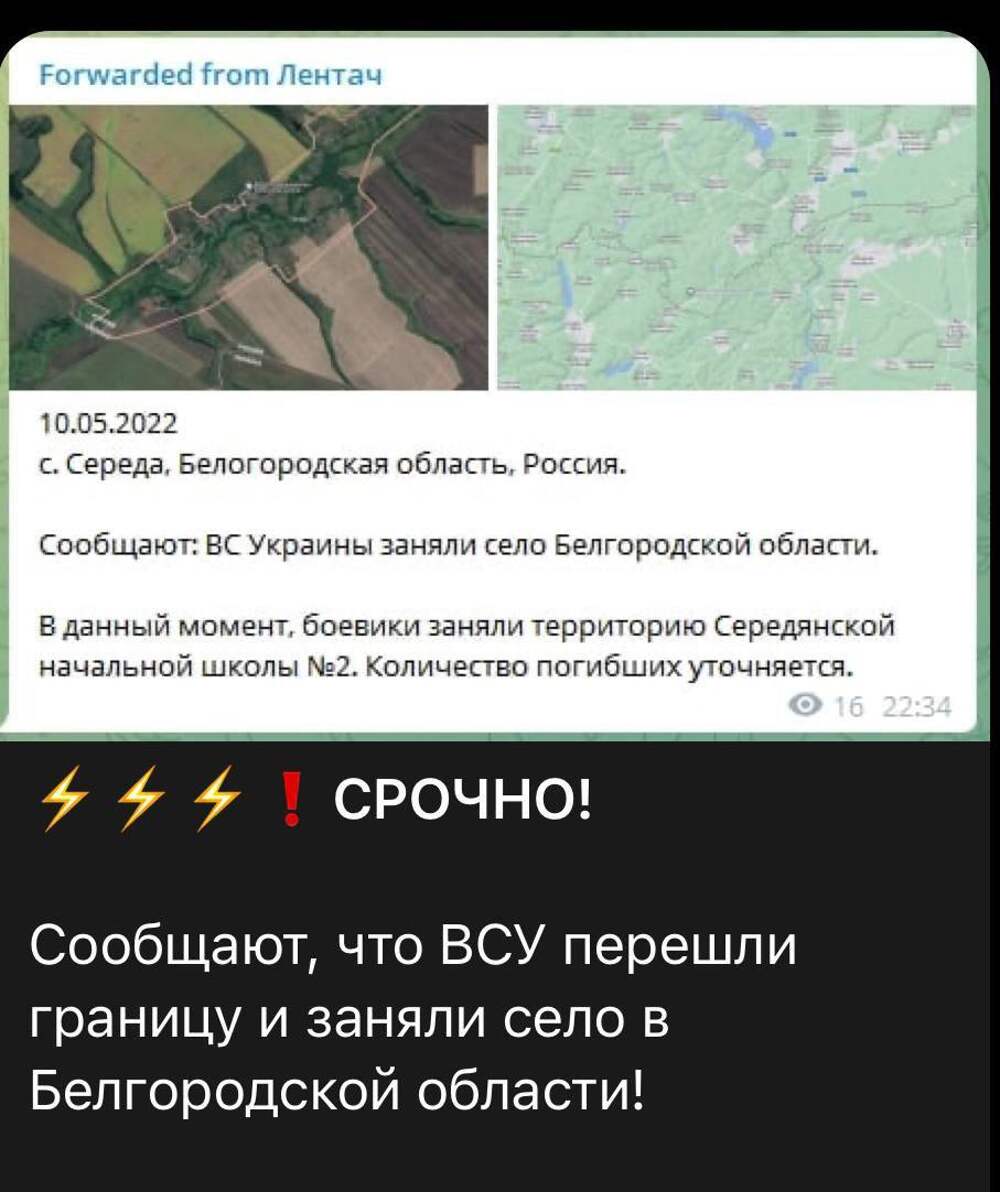 Фейк: Украинские военные перешли границу и заняли села Муром и Середа в Белгородской области. Такая информация распространяется в украинских источниках и псевдопатриотических местных телеграм-каналах, якобы со ссылкой на Лентач.